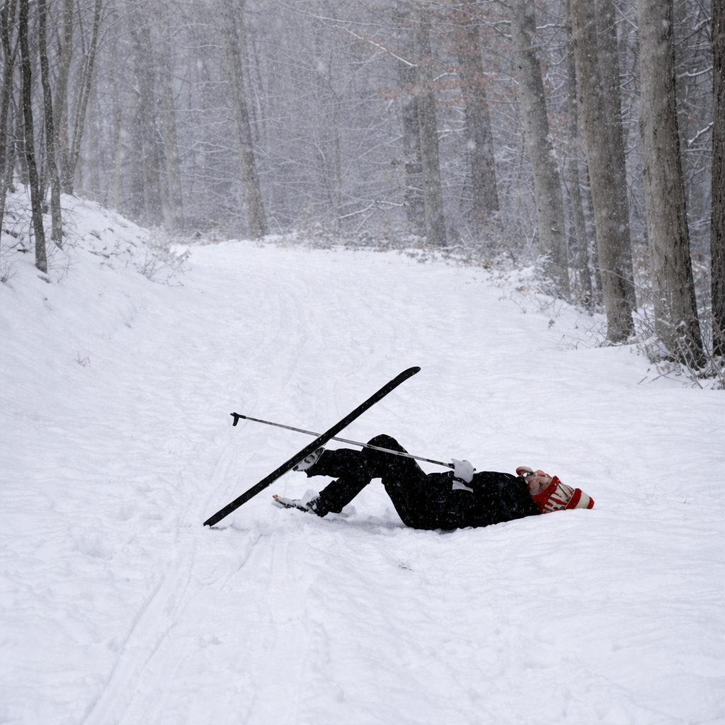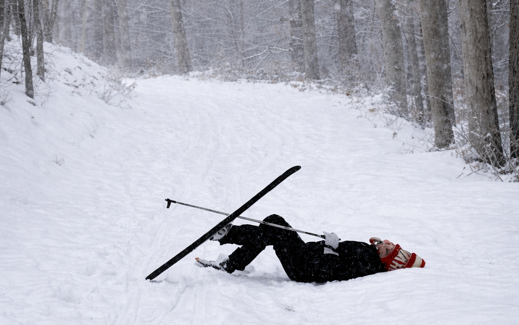 I nagle… na prostej, spokojnej drodze traci równowagę i z impetem ląduje na śniegu.
